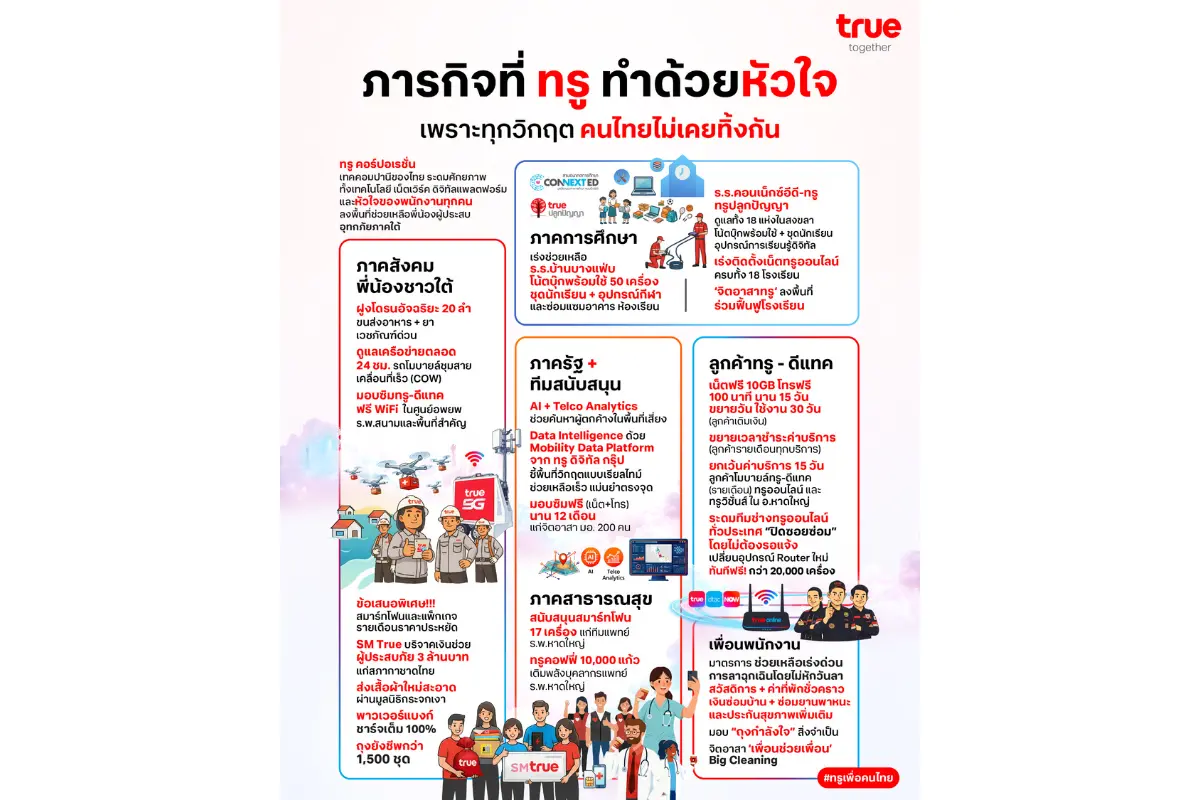 ทรู เดินหน้า “ภารกิจแห่งหัวใจ” เพื่อให้ลูกค้าคนสำคัญยังใช้งานได้อย่างต่อเนื่องแบบไร้กังวล มอบเน็ตฟรี 10GB โทรฟรี 100 นาที นาน 15 วัน พร้อมขยายวันใช้งานและขยายเวลาชำระค่าบริการทั้งแบบเติมเงินและรายเดือน ช่วยลดภาระในช่วงเวลาที่ยากลำบาก ยิ่งไปกว่านั้น ยังยกระดับความช่วยเหลือด้วยการ “ยกเว้นค่าบริการ” สำหรับลูกค้ามือถือ ทรูออนไลน์ และทรูวิชั่นส์ในพื้นที่อ.หาดใหญ่เป็นเวลา 15 วัน ขณะที่ทีมทรูออนไลน์ลุยภารกิจ “ปิดซอยซ่อม” ระดมช่างจากทั่วประเทศเข้าซ่อม เปลี่ยนอุปกรณ์ฟรีทันที พร้อมจัดเตรียม Router ใหม่กว่า 20,000 เครื่อง เพื่อให้ทุกบ้านกลับมาเชื่อมต่อได้เร็วที่สุด แบบไม่ต้องรอให้ลูกค้าแจ้งปัญหา เพราะไม่ว่าสถานการณ์จะเป็นอย่างไร ทรูพร้อมเคียงข้างลูกค้าเสมอ