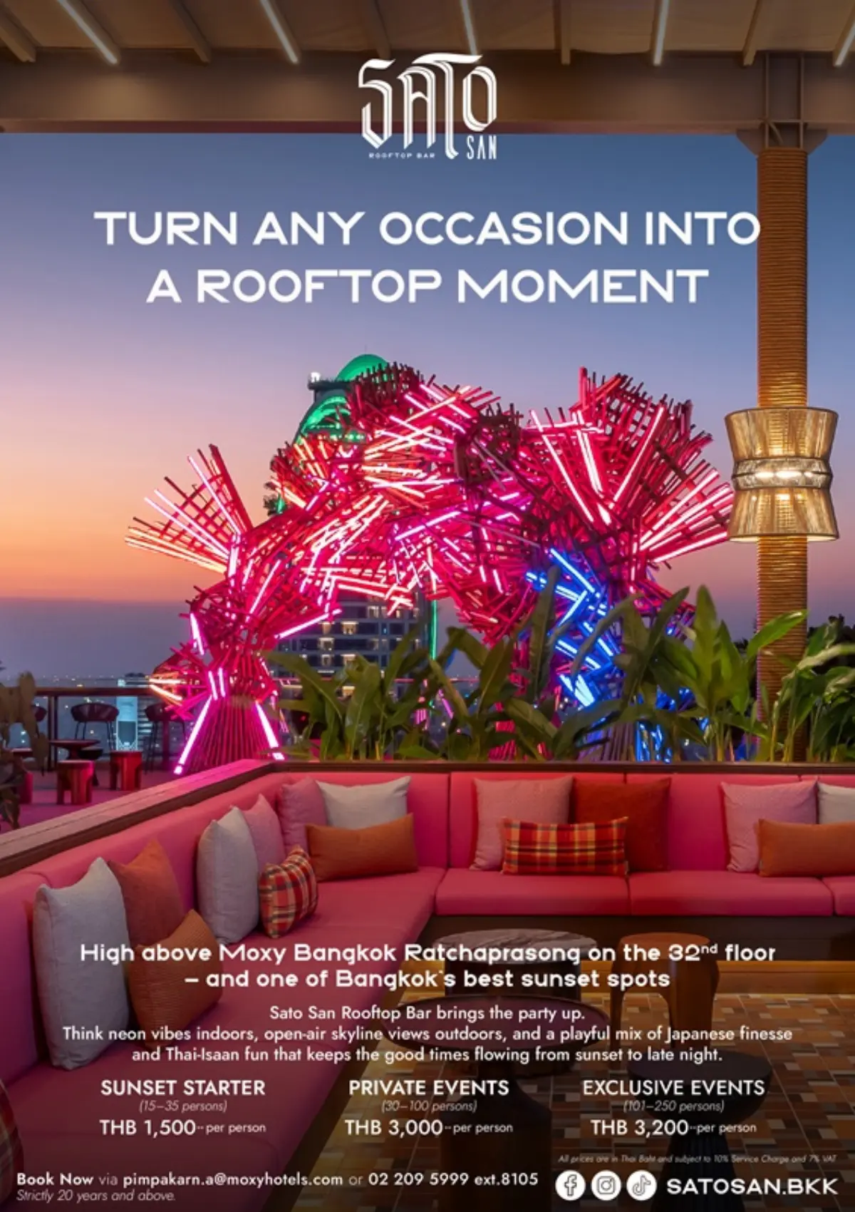 For other enquiries, private events, or exclusive rooftop events, please contact [email protected], call +66 2 209 5999, or visit www.marriott.com/bkkox. Culinary updates are available at www.satosanrooftopbar.com and www.moxybarandrestaurantbangkok.com, via LINE @MoxyBangkok. For direct rooftop enquiries, email [email protected] and follow social channels @satosan.bkk.